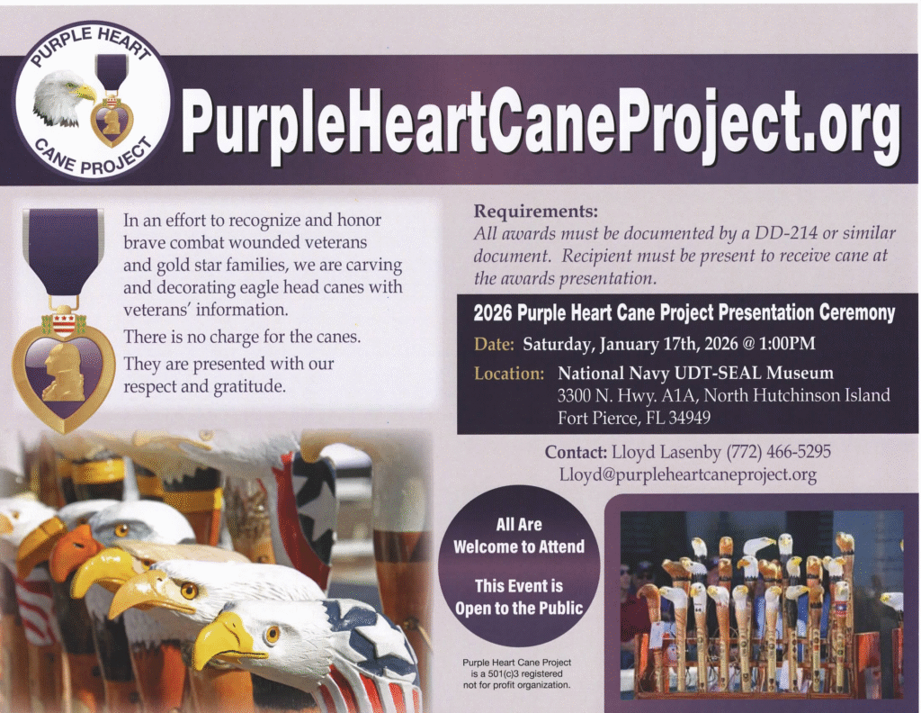 Purple Heart Cane Project Honor veterans who were wounded in action by presenting carved Purple Heart canes. This ceremony was at The National Navy UDT-SEAL Museum in Fort Pierce, Florida on January 17, 2026.