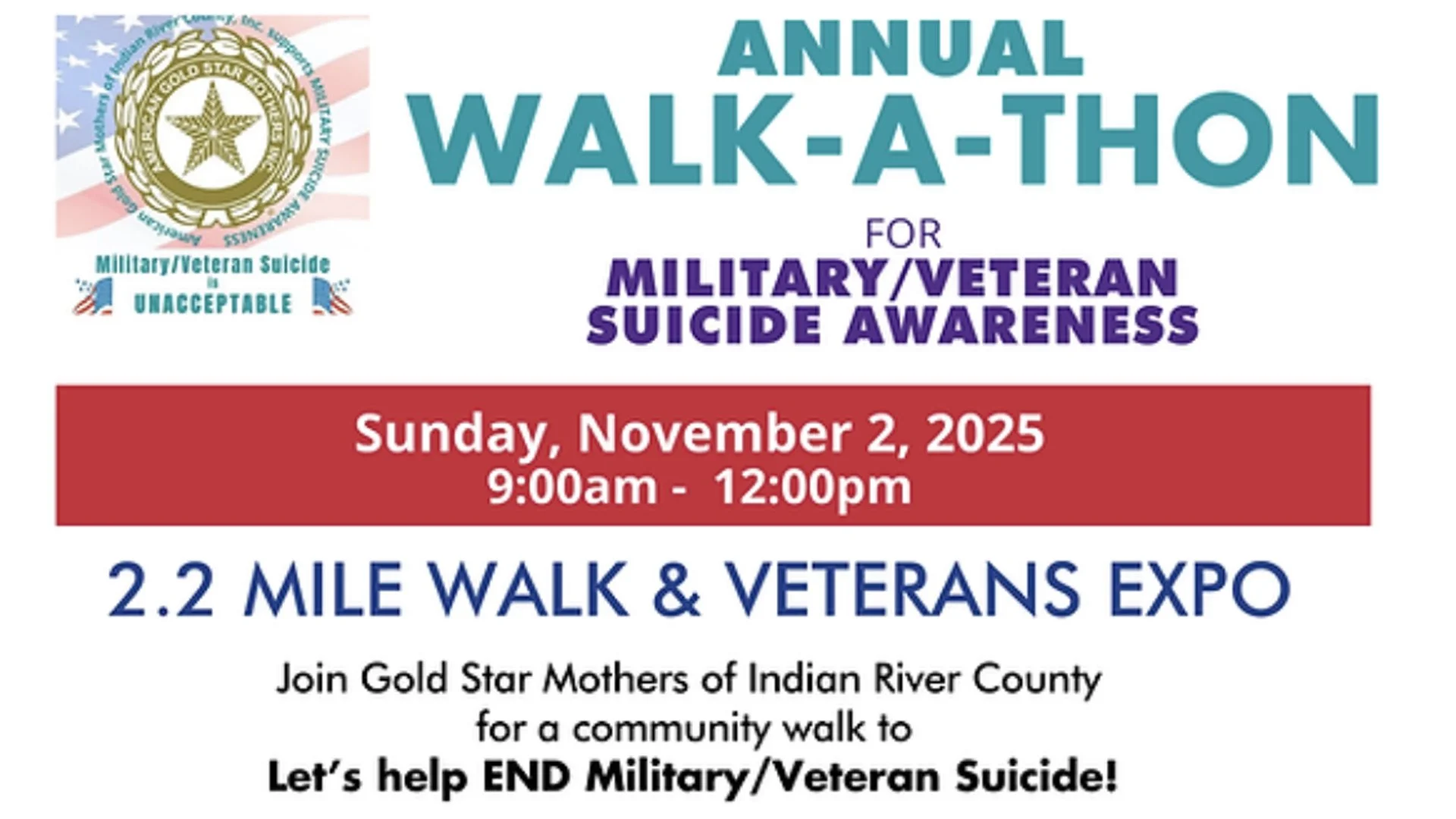 The 7th annual WALK-A-THON for Military/Veterans Suicide Awareness was on November 2, 2025 in Riverside Park, Vero Beach FL. This event was hosted by the American Gold Star Mothers of Indian River County to bring awareness to and help end the estimated 22 Veterans suicides that happen daily in the United States. This annual event is held the Sunday before Veterans Day and is combined with a Veteran's Resources Expo. Veterans, families and friends are encouraged to come out to raise awareness of this tragic circumstance and learn about programs, discounts, businesses and organizations are available for Veterans and their families.
